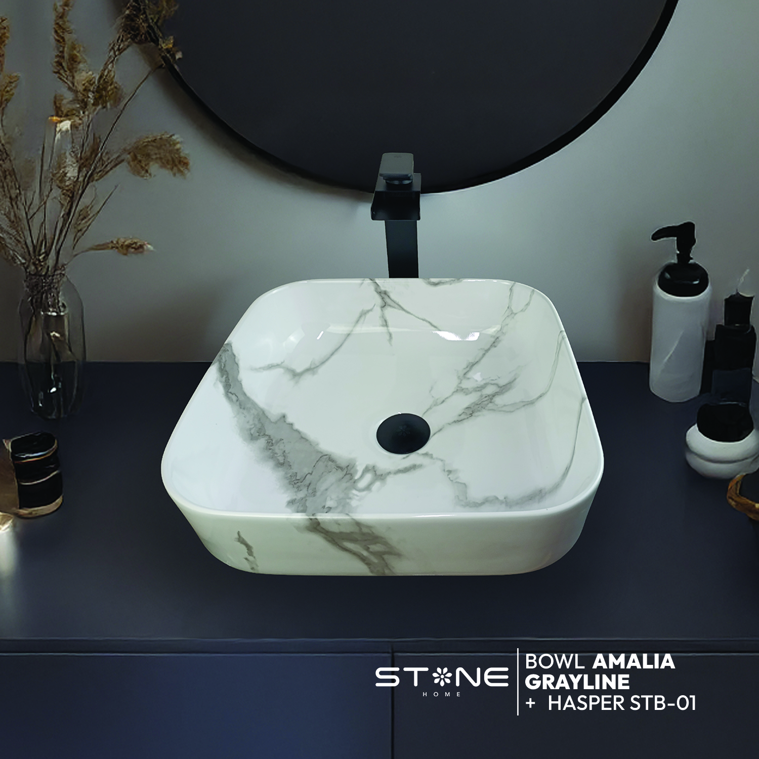 COMBO BOWL AMALIA GRAYLINE + MEZCLADORA HASPER STB-01 + DESAGUE POP UP GRANDE NEGRO S/REBOSE P/BOWL CUERPO 8 CM COLA 18 CM