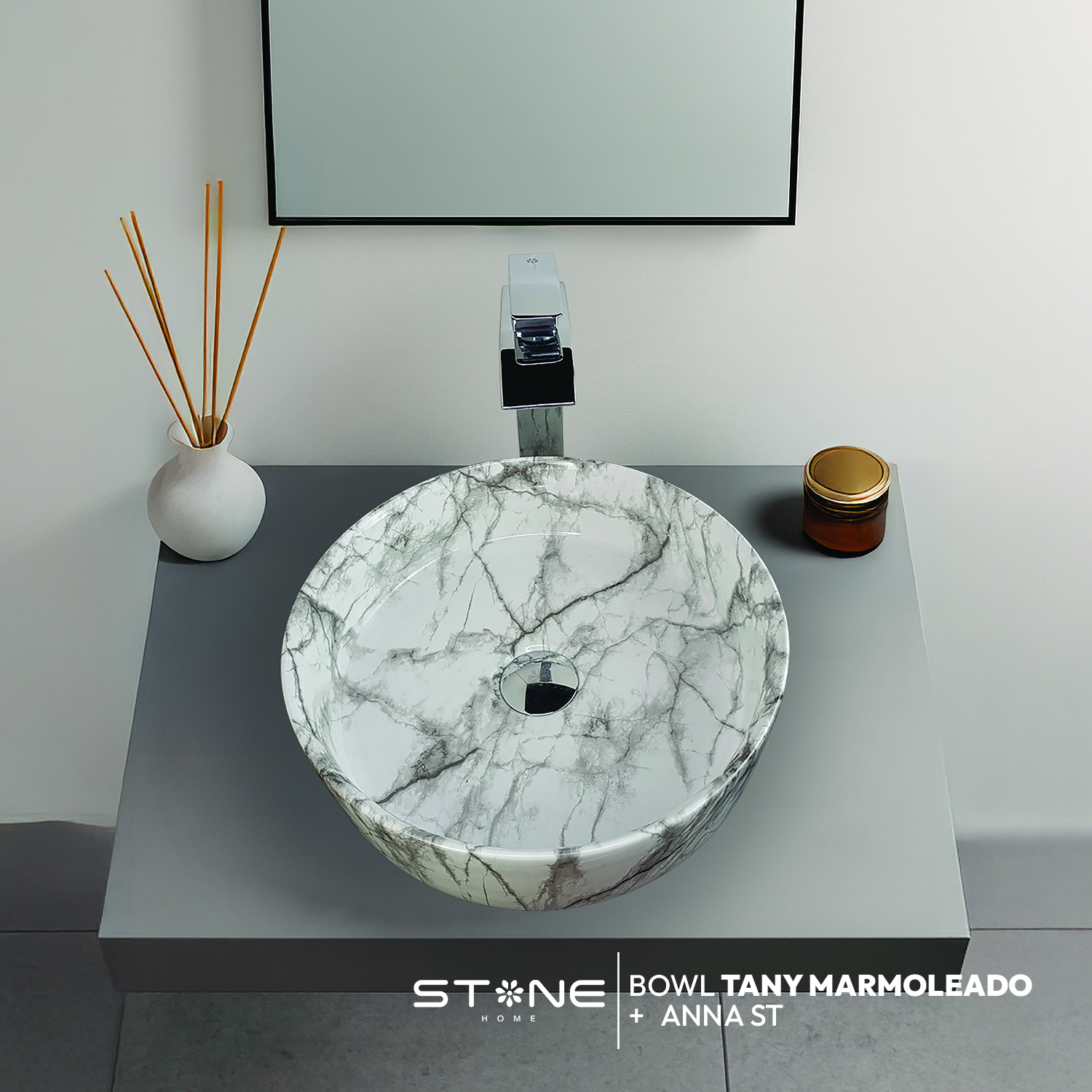 COMBO BOWL TANY MARMOLEADO + MEZCLADORA ANNA ST + DESAGUE POP UP GRANDE CROMADO S/REBOSE P/BOWL CUERPO 10CM COLA 18 CM
