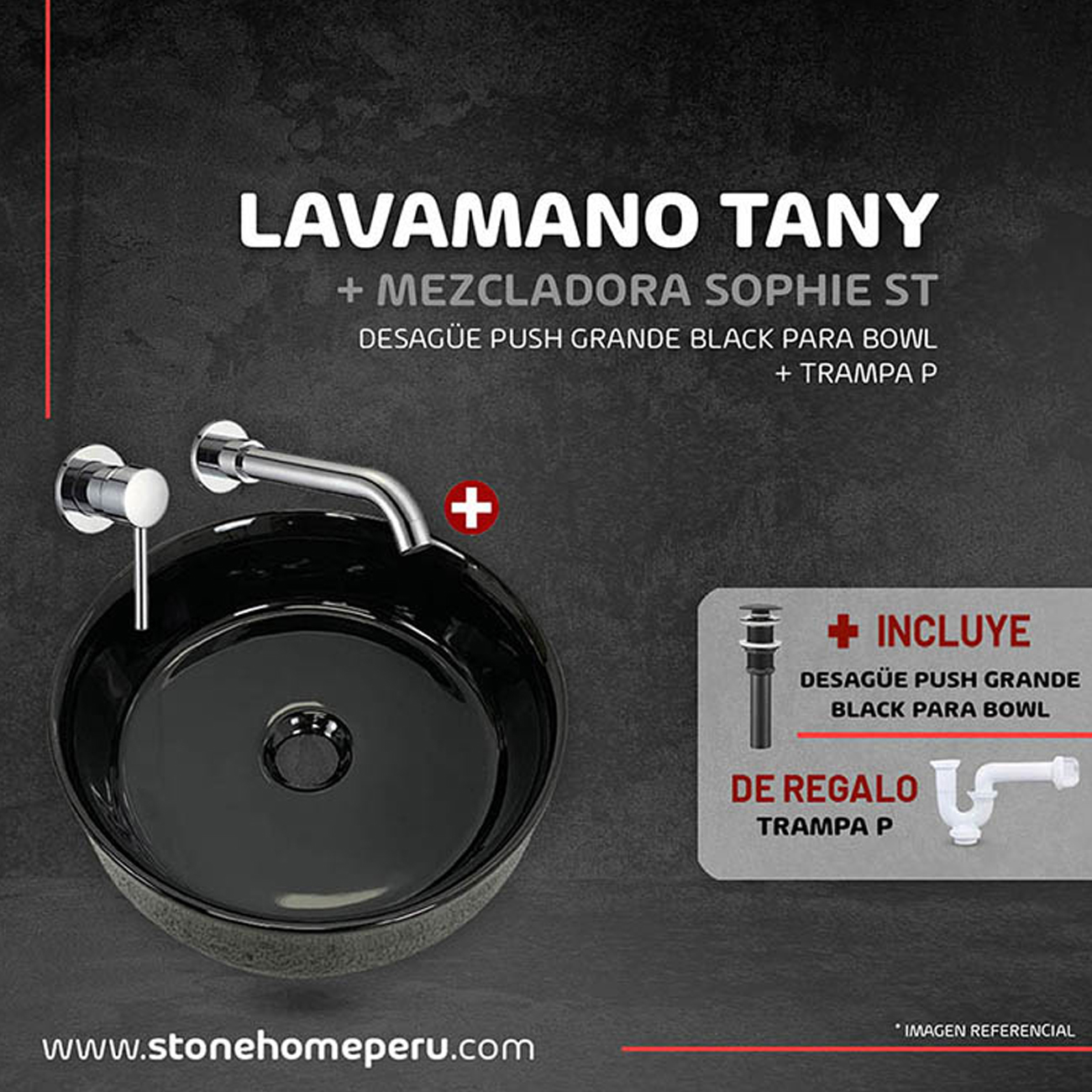COMBO BOWL TANY NEGRO + MEZCLADORA P/BOWL A LA PARED SOPHIE ST CROMADO + DESAGUE POP UP GRANDE NEGRO S/REBOSE P/BOWL CUERPO 8 CM COLA 18 CM STONE