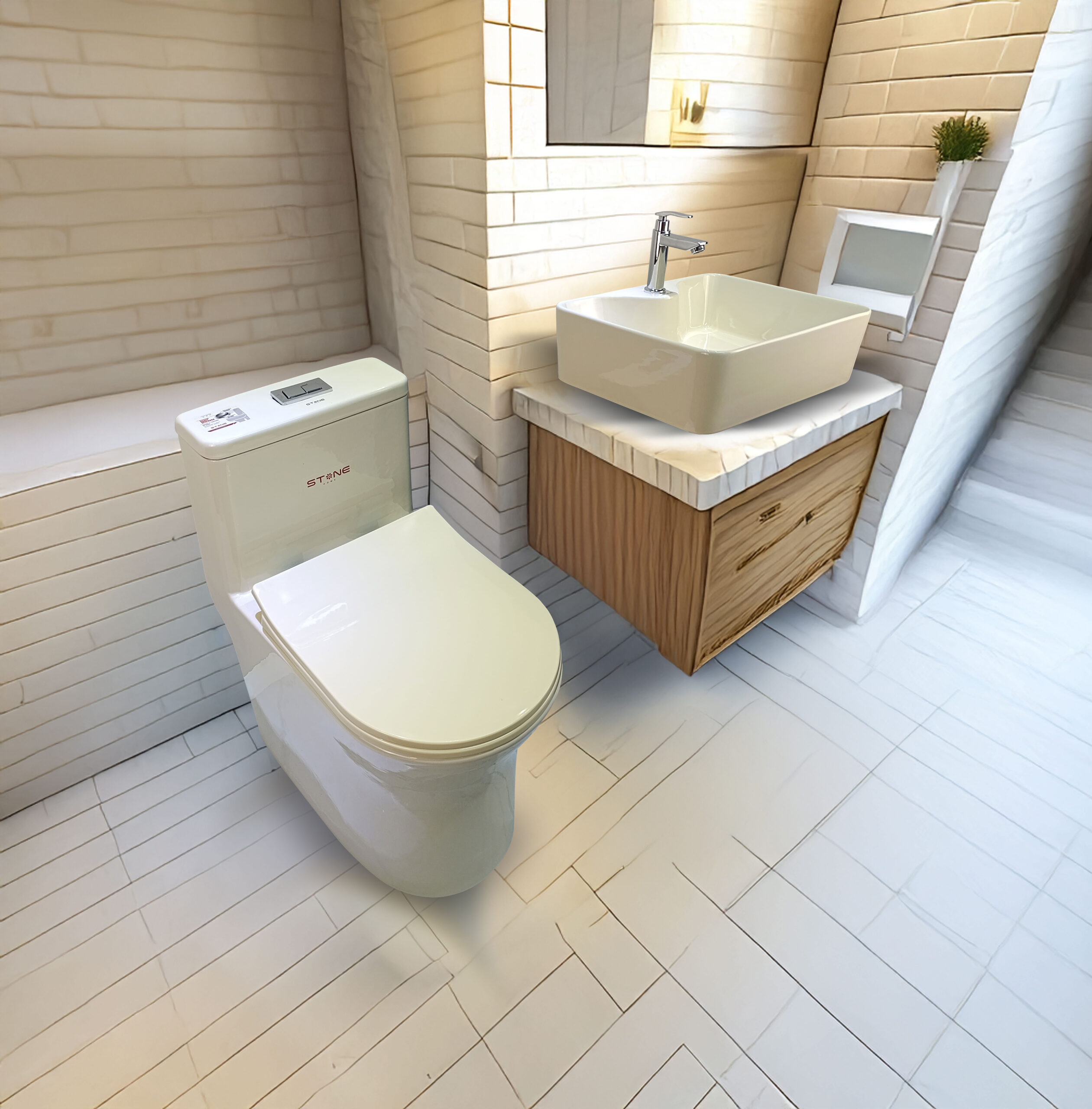 COMBO DE INODORO STAN BONE + BOWL ADELINE BONE + DESAGUE POP UP GRANDE CROMADO S/REBOSE P/BOWL CUERPO 10CM COLA 18 CM *INCLUYE TUBO DE ABASTO DE VINIL REFORZADO F1/2*M1/2 BRONCE STONE*
