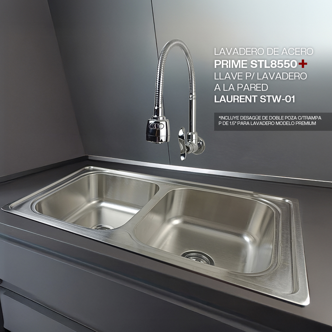 COMBO DE LAVADERO DE ACERO PRIME STL8550+LLAVE P/ LAVADERO A LA PARED LAURENT STW-01+ DESAGUE DE DOBLE POZA C/ TRAMPA P DE 1.5″ PARA LAVADERO MODELO PREMIUM