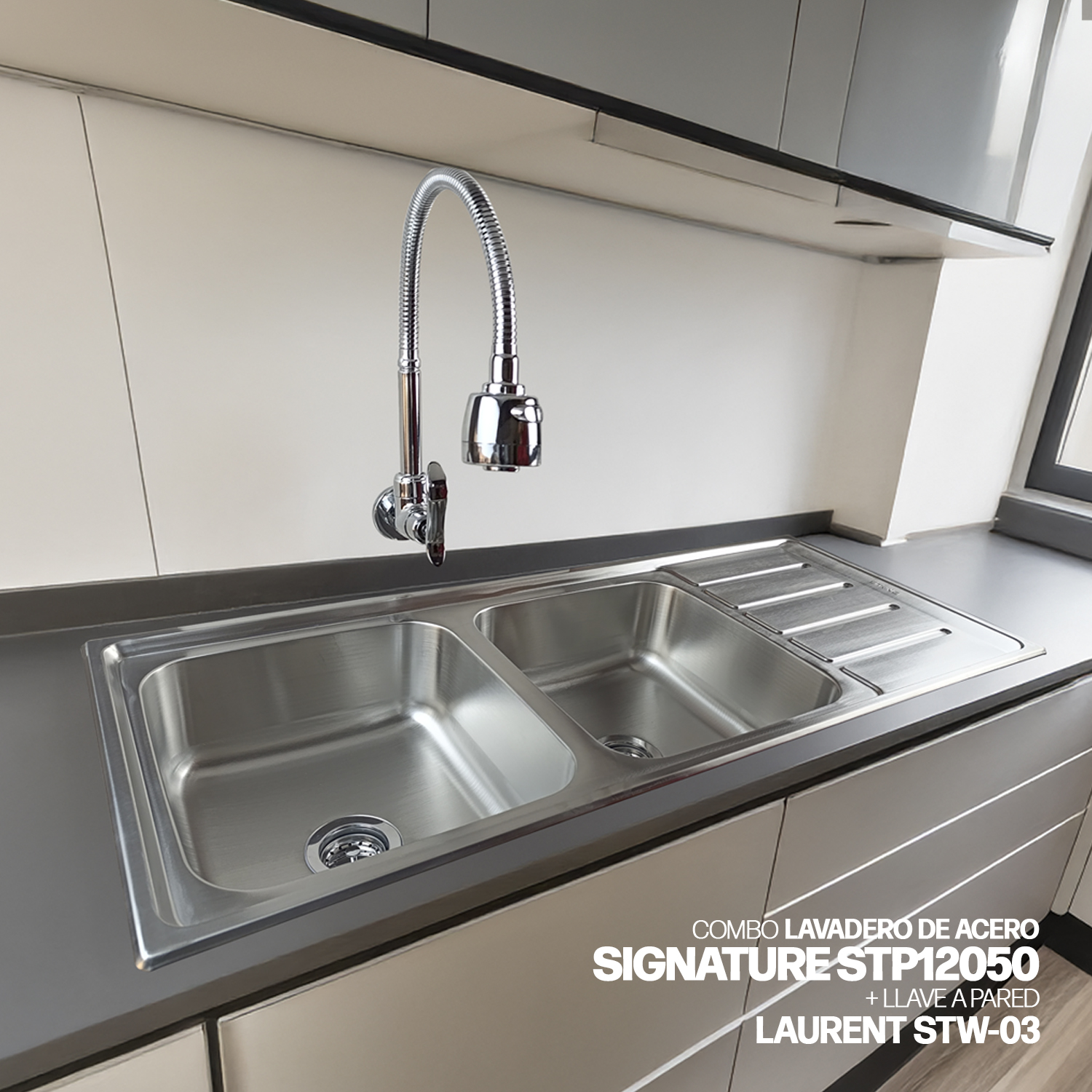COMBO DE LAVADERO DE ACERO SIGNATURE STP12050 STONE + DESAGÜE DE DOBLE POZA C/TRAMPA P DE 1.5″ PARA LAVADERO + LLAVE A LA PARED LAURENT STW-03 STONE