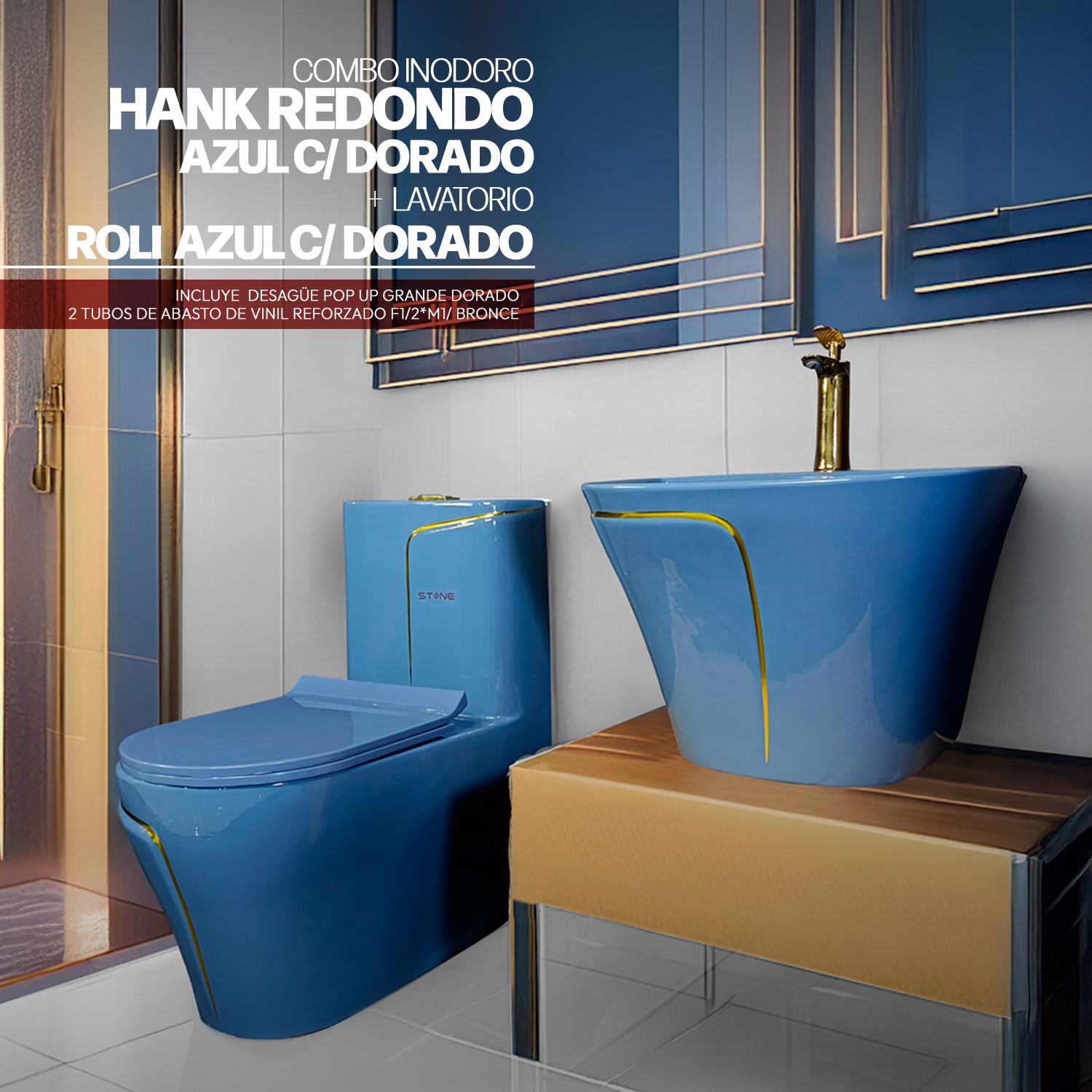 COMBO HANK REDONDO AZUL C/ DORADO + ROLI AZUL C/DORADO + DESAGUE POP UP GRANDE DORADO S/REBOSE P/BOWL CUERPO 10CM COLA 18 CM *INCLUYE 2 TUBOS DE ABASTO DE VINIL REFORZADO F1/2*M1/2 BRONCE STONE*