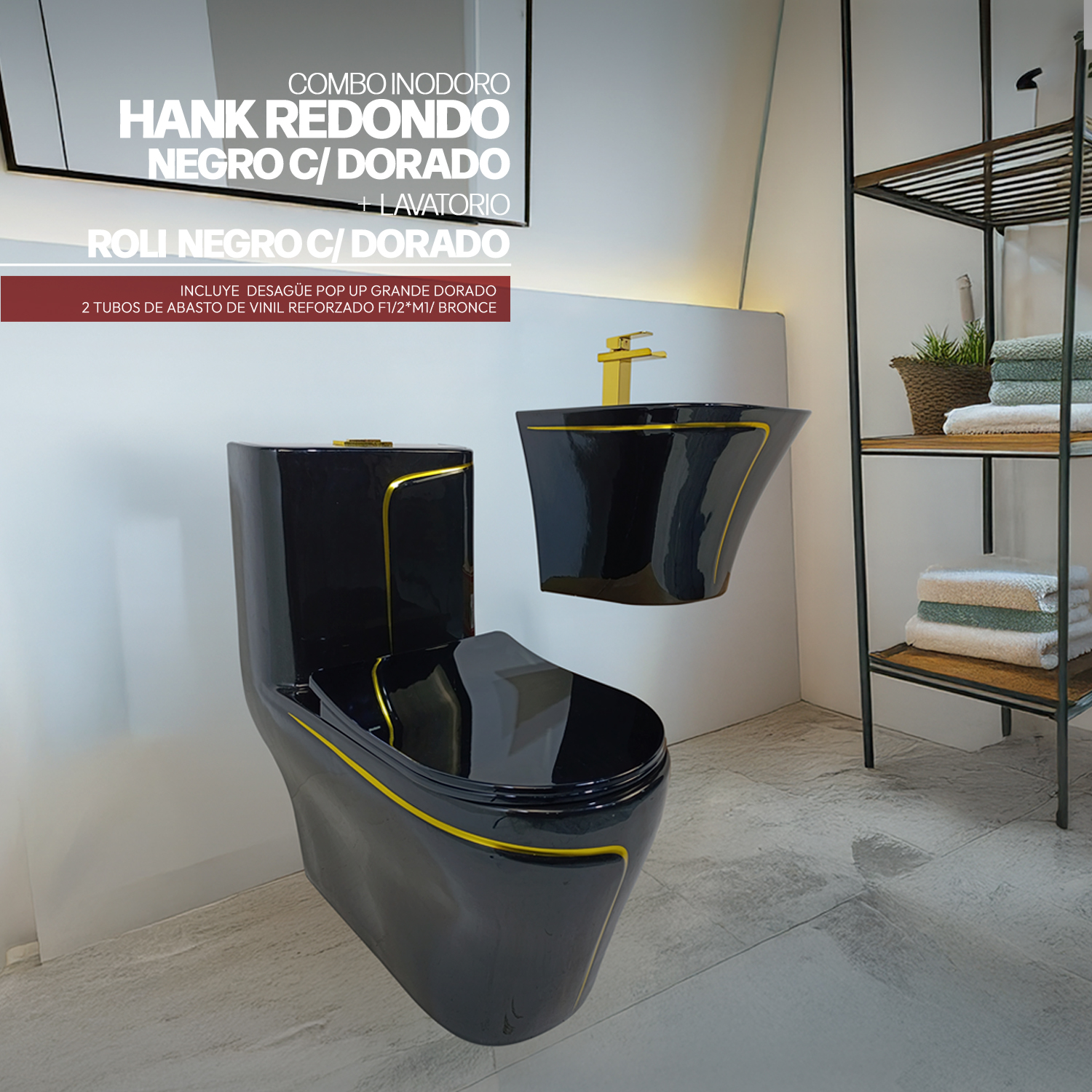 COMBO HANK REDONDO NEGRO C/ DORADO STONE + LAVATORIO ROLI NEGRO C/ DORADO STONE + DESAGUE POP UP GRANDE DORADO S/REBOSE P/BOWL CUERPO 10CM COLA 18 CM *INCLUYE 2 TUBOS DE ABASTO DE VINIL REFORZADO F1/2*M1/2 BRONCE STONE*