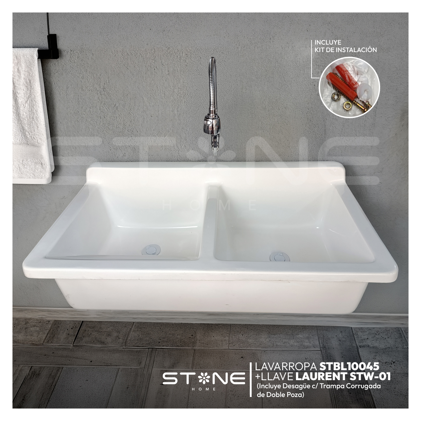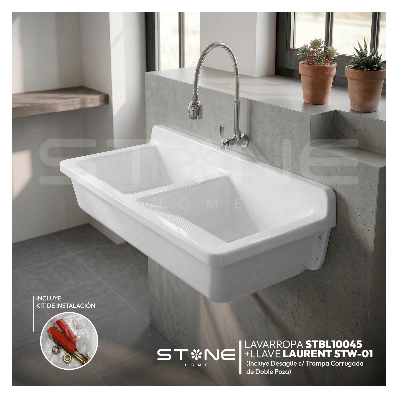 COMBO LAVARROPAS DE FIBRA DE VIDRIO STBL10045 + LLAVE LAURENT STW-01 STONE + DESAGÜE C/TRAMPA CORRUGADA DE DOBLE POZA *KIT DE INSTALACIÓN STONE