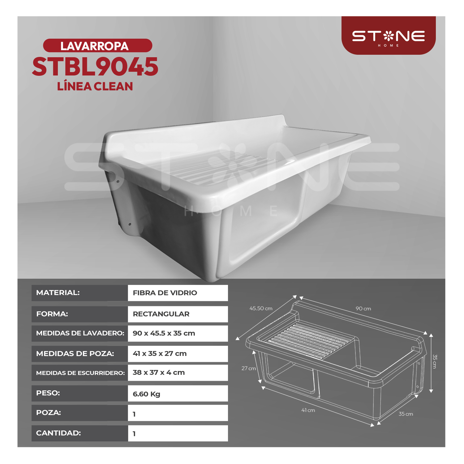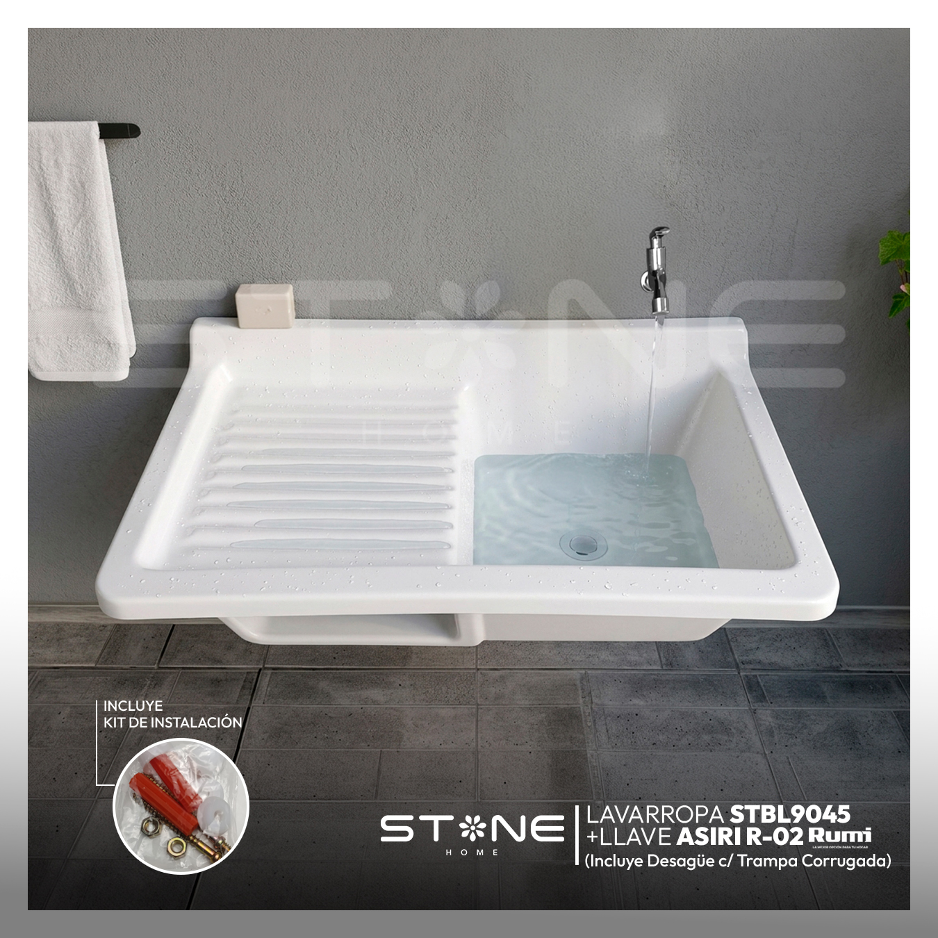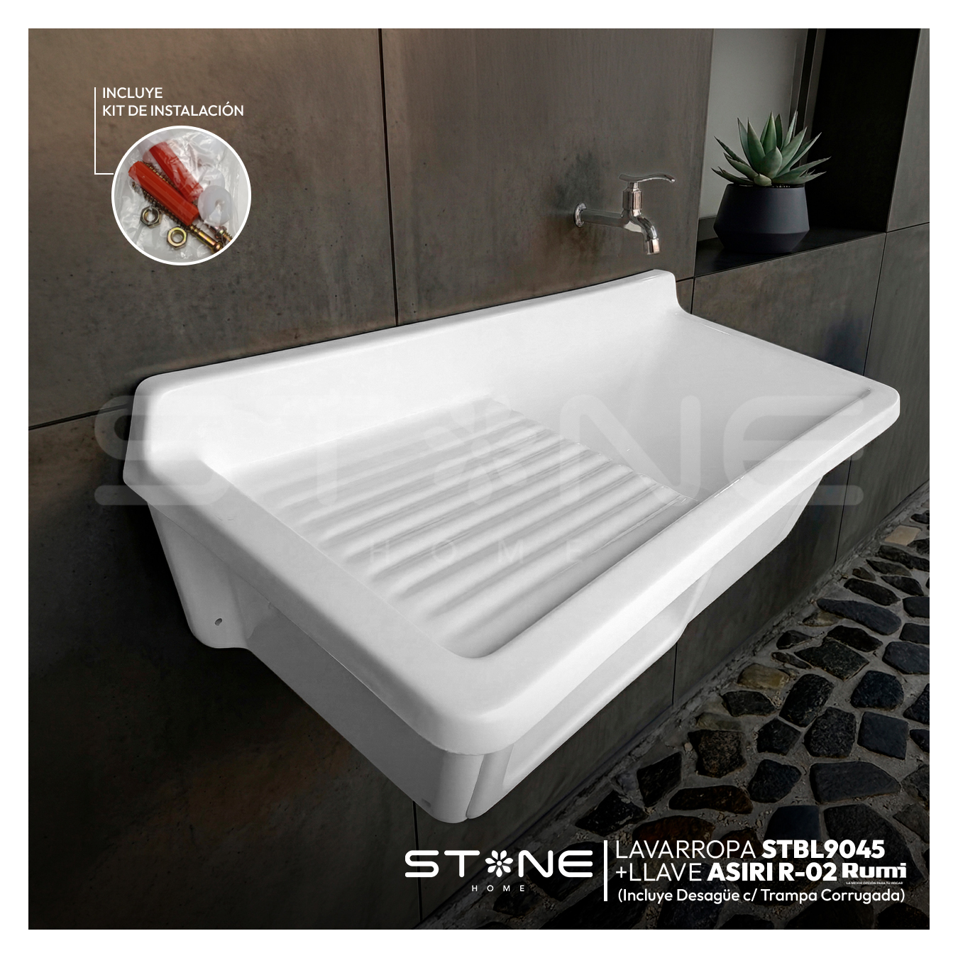 COMBO LAVARROPAS DE FIBRA DE VIDRIO STBL9045 + LLAVE ASIRI R-02 RUMI + DESAGÜE C/TRAMPA CORRUGADA *KIT DE INSTALACIÓN STONE