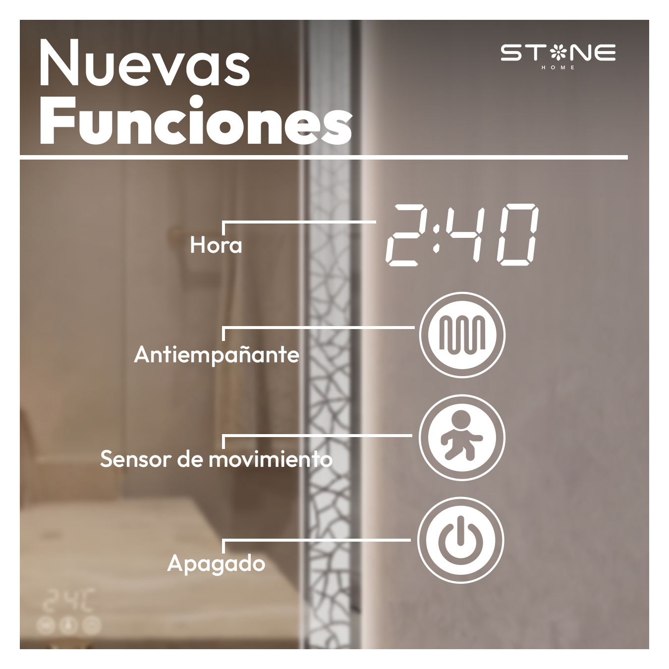 ESPEJO LED TACTIL CON SENSOR DE MVM POU C/ RELOJ Y ANTIAMPAÑE 100X70CM STONE