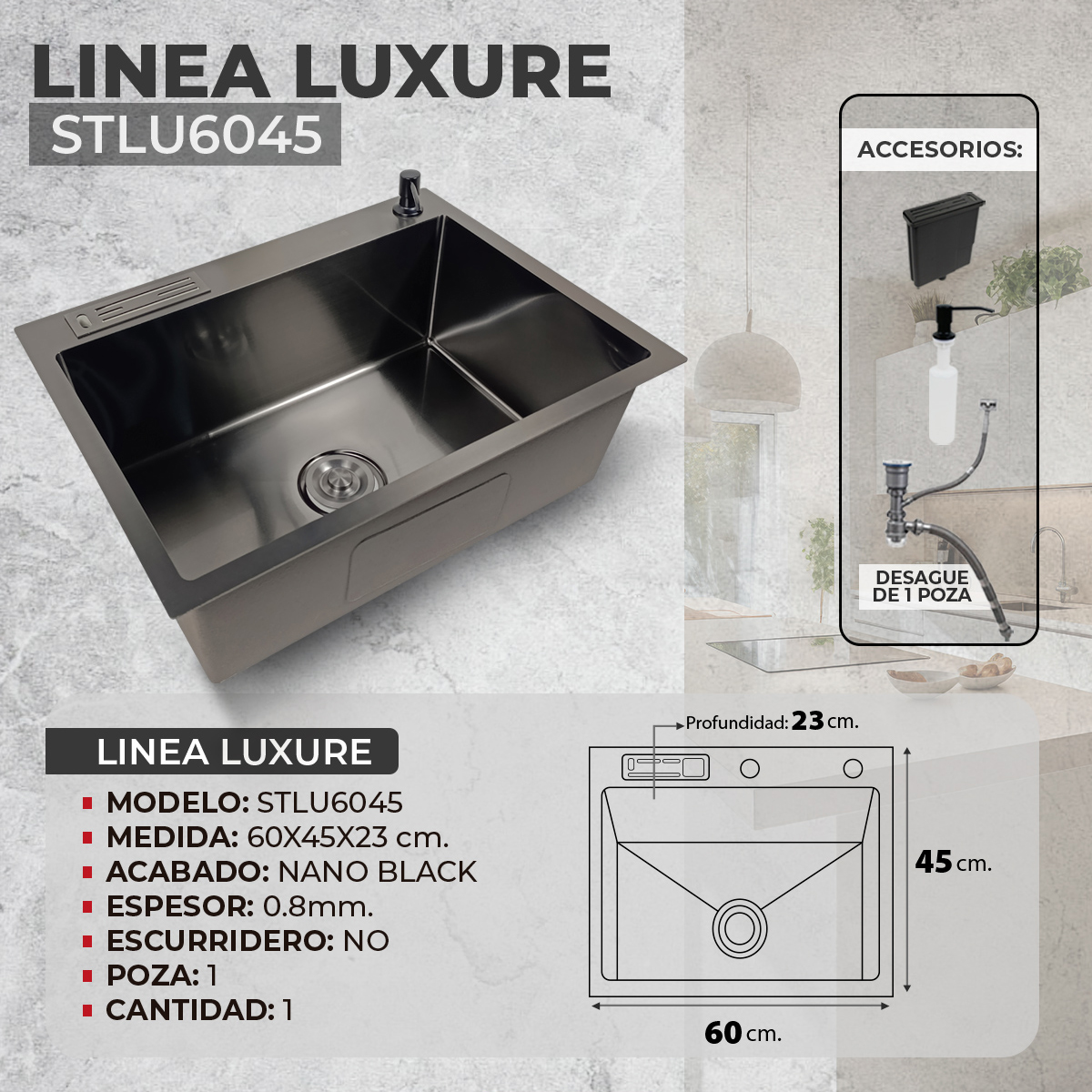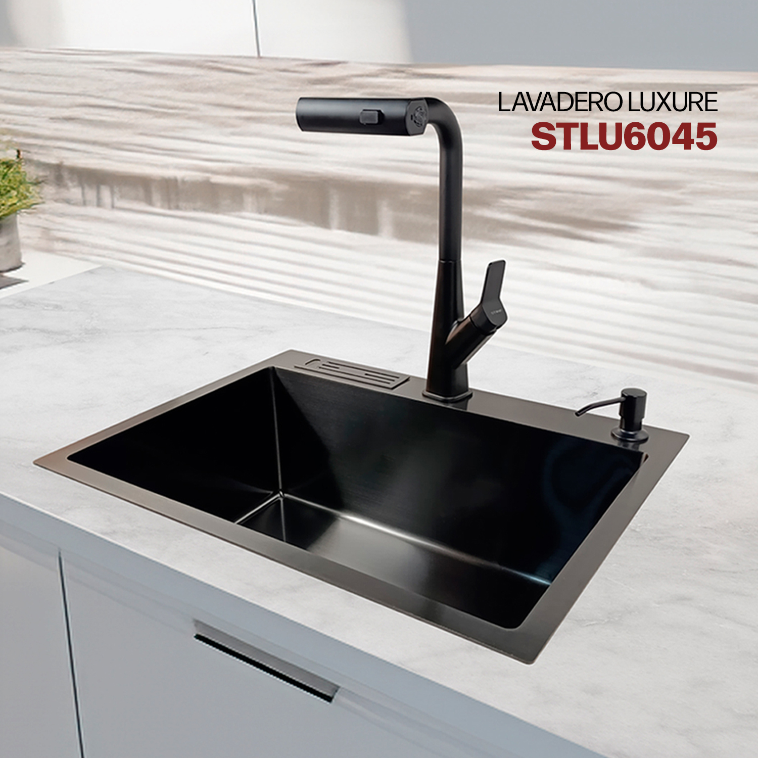 LAVADERO DE ACERO LUXURE STLU6045 CON PORTACUCHILLO Y DISPENSADOR DE JABON NANO BLACK NANOBLACK STONE